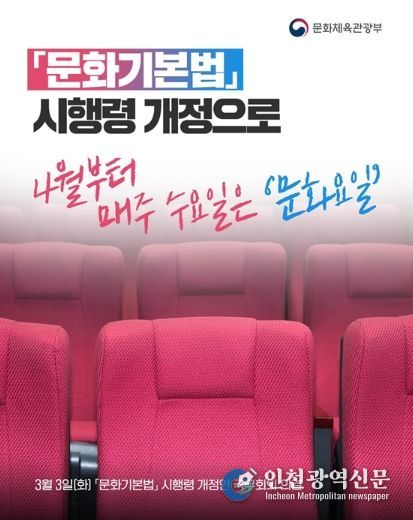 [인천광역신문] 관리자 기자 | 「문화기본법」 시행령 개정으로 4월부터 매주 수요일은 '문화요일'
