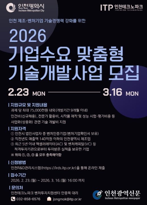 [인천광역신문] 관리자 기자 | 인천테크노파크(인천TP)는 지역 제조벤처기업의 기술경쟁력 강화를 위해 ‘2026년 기업수요 맞춤형 기술개발사업’의 참여기업을 오는 3월 16일까지 모집한다고 밝혔다.