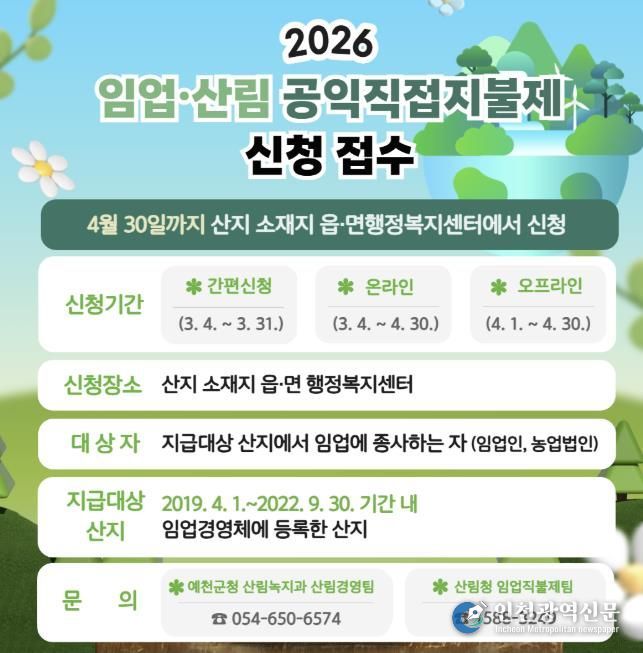 [인천광역신문] 관리자 기자 | 예천군은 임업인의 소득 안정과 산림의 공익기능 증진을 위해 4월 30일까지 ‘2026년 임업·산림 공익직접지불금’ 신청을 받는다.