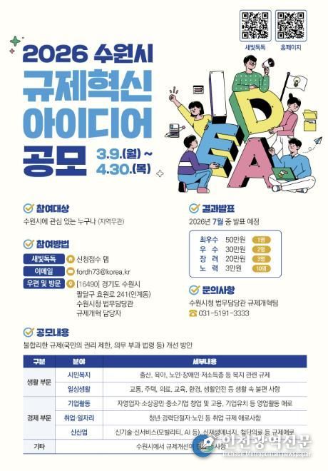 [인천광역신문] 관리자 기자 | 수원특례시가 9일부터 4월 30일까지 ‘2026 규제혁신 아이디어’를 공모한다.
