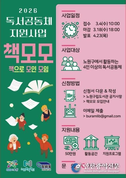 [인천광역신문] 관리자 기자 | 서울 노원구가 책을 매개로 주민 간 공감과 연대를 확장하는 독서공동체 지원사업 '책모모(책으로 모인 모임)' 공모를 진행한다고 밝혔다.