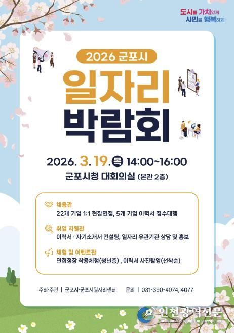 [인천광역신문] 관리자 기자 | 군포시는 오는 3월 19일 오후 2시부터 시청 대회의실에서 ‘2026년 군포시 일자리 박람회’를 개최한다. 이번 박람회는 지역 내 우수 기업과 구직자가 직접 만나는 채용의 장으로 제조, 서비스, 물류배송, 의료복지 등 다양한 분야에서 폭넓은 취업 기회를 제공할 예정이다.