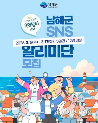 [인천광역신문] 관리자 기자 | 남해군이 ‘2026년 자연과 감성의 국민쉼터’ 남해의 다채로운 매력을 널리 전파할 ‘제9기 남해군 SNS 알리미단’을 오는 3월 5일부터 17일까지 13일간 모집한다.