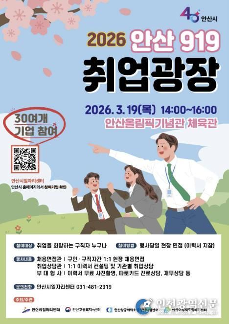 [인천광역신문] 관리자 기자 | 안산시는 오는 19일 안산올림픽기념관 체육관에서 구인기업의 인력난 해소와 구직자의 취업 기회 확대를 위한 ‘안산 919취업광장’을 개최한다고 6일 밝혔다.
