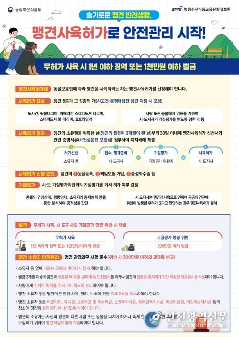 [인천광역신문] 관리자 기자 | 농림축산식품부는 맹견 안전관리 제도의 안정적 정착과 국민 인식 향상을 위해 홍보영상인 ‘슬기로운 맹견 반려생활’을 배포했다고 밝혔다.