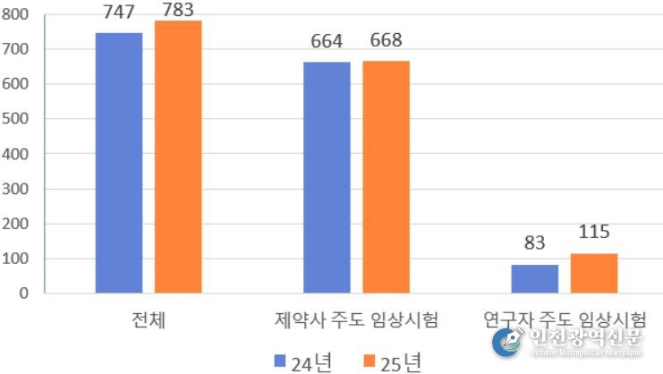 [인천광역신문] 관리자 기자 | 식품의약품안전처는 2025년 의약품 임상시험 승인 현황을 분석한 결과 전년 대비 4.8% 상승한 전체 783건의 임상시험이 승인된 것으로 확인됐다.