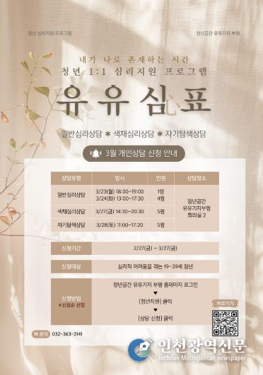 [인천광역신문] 관리자 기자 | 부평구 청년공간 유유기지 부평은 청년 마음 건강 회복을 위한 심리지원 프로그램 ‘유유심(心)표’의 3월 참여자를 모집한다.