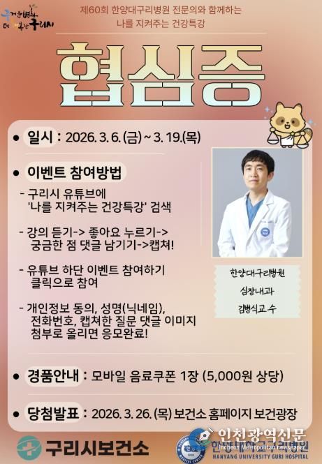 특강은‘구리비전’ 채널을 통해 시청할 수 있다. 시청 후 6일부터 19일까지 궁금한 사항을 댓글로 남기면 우수질문 3건을 선정해 한양대구리병원 심장내과 김병식 교수가 직접 답변할 예정이다. 또한 참여자 중 17명을 무작위로 선정해 우수 질문자 3명을 포함한 총 20명에게 모바일 쿠폰을 증정한다.