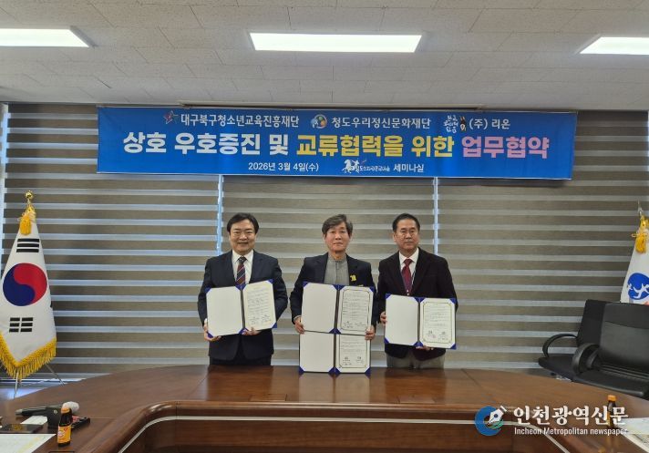 [인천광역신문] 관리자 기자 | 청도우리정신문화재단(대표이사 기화서)은 지난 3월 4일 화랑정신을 이어가는 청도신화랑풍류마을에서 (재)대구북구청소년교육진흥재단(상임이사 이복우), 한국코미디타운 운영주체 ㈜리온(대표 김미숙)과 상호 우호 증진 및 교류 협력을 위한 업무협약(MOU)을 체결했다.