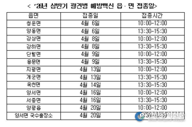 [인천광역신문] 관리자 기자 | 양평군은 오는 4월 6일부터 4월 24일까지 광견병 예방접종을 실시한다고 밝혔다.