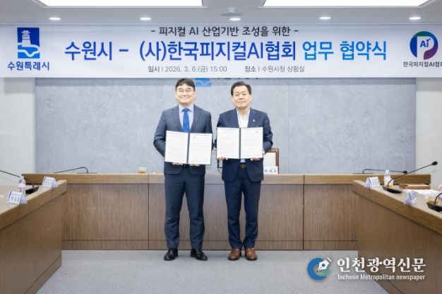 [인천광역신문] 관리자 기자 | 수원특례시와 (사)한국피지컬에이아이(AI)협회는 6일 시청 상황실에서 업무협약을 체결하고, 피지컬 인공지능(AI) 산업 활성화를 위해 적극적으로 협력하기로 했다.