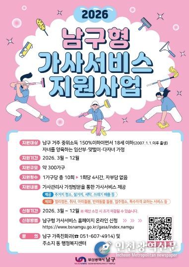 [인천광역신문] 관리자 기자 | 부산 남구는 임산부·맞벌이·다자녀 가정의 가사 부담을 완화하기 위해 '2026년 남구형 가사서비스 지원사업'을 3월 9일부터 시행한다고 밝혔다.