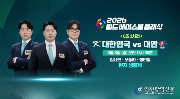 [인천광역신문] 관리자 기자 | 2026 월드 베이스볼 클래식(WBC) 1라운드에서 대한민국이 8강 진출을 향한 중요한 승부를 앞두고 있다. MBC는 오늘(8일) 오전 11시 30분부터 일본 도쿄돔에서 열리는 대한민국과 대만의 WBC 1라운드 3차전 경기를 도쿄 현지에서 생중계한다.