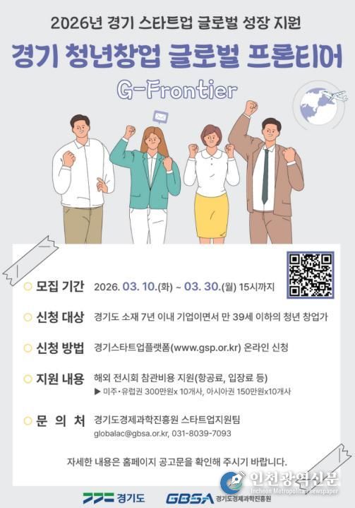 [인천광역신문] 관리자 기자 | 경기도와 경기도경제과학진흥원은 도내 청년 창업가들의 글로벌 시장 진출의 시작을 돕는 ‘경기 청년창업 글로벌 프론티어(G-Frontier)’ 참여기업 20개사를 오는 30일까지 모집한다.