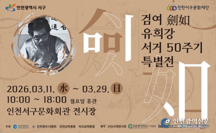 [인천광역신문] 관리자 기자 | (재)인천서구문화재단은 오는 3월 11일부터 3월 29일까지 인천서구문화회관 전시장에서 ‘검여 유희강 선생 50주기 기념 특별전’을 개최한다.