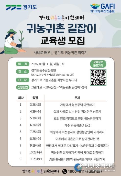 [인천광역신문] 관리자 기자 | 경기도와 경기도농수산진흥원이 운영하는 경기도귀농귀촌지원센터에서 도내 귀농귀촌 사례를 중심으로 지역 특성과 정착 경험을 전달하기 위해 ‘귀농귀촌 길잡이’ 교육을 운영한다.