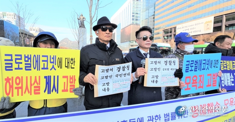글로벌에코넷과 국민연대, 행·의정 감시네트워크 중앙회, 국민생명안전네트워크, 인천 행·의정 감시네트워크, 기업윤리 경영을 위한 시민단체협의회 등 단체들은 10일 오전 서울 광화문 이순신 장군 동상 앞에서 기자회견을 열고, 온라인 카페 등에 허위 사실을 게시해 단체의 명예를 훼손한 15명을 ‘정보통신망법 위반(명예훼손) 및 모욕’ 혐의로 경찰청에 고소·고발 했다고 밝혔다.