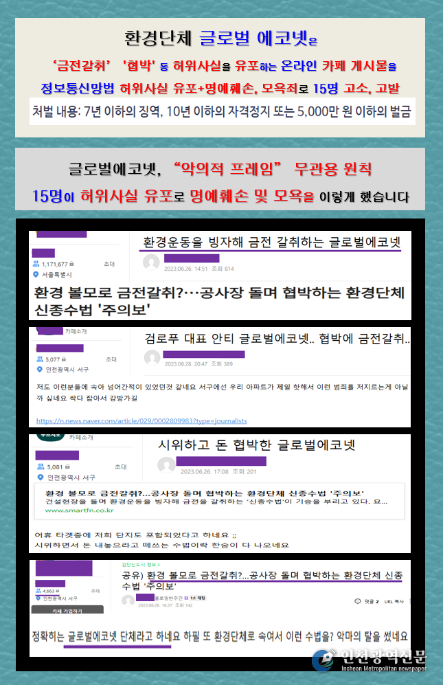 게시글 제목에는 ▲“환경운동 빙자해 금전 갈취하는 글로벌에코넷”, ▲“증거만 잡히면 입건! 환경단체 위장 글로벌에코넷” ▲“환경 볼모로 돈 협박 글로벌에코넷 아세요” ▲“공사장 돌며 협박하는 환경단체 신종 수법 '주의보” 등 자극적인 허위 사실이 단체의 실명과 함께 담겼다.