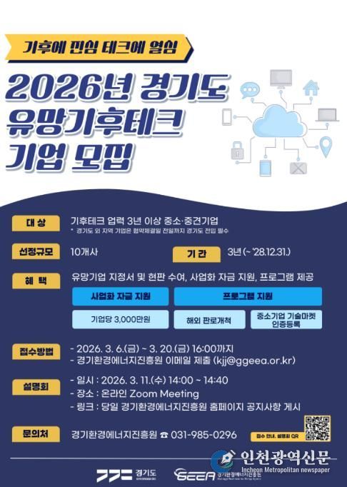 [인천광역신문] 관리자 기자 | 경기도와 경기환경에너지진흥원이 기후위기 대응을 선도할 혁신 기술 보유 기업을 발굴하기 위해 오는 3월 20일까지 ‘2026년 경기도 유망 기후테크 기업’ 10곳을 모집한다.