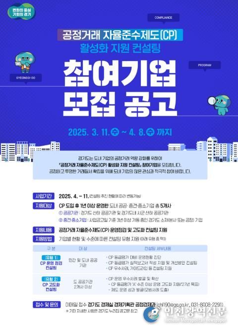 [인천광역신문] 관리자 기자 | 경기도가 기업의 공정거래 자율준수 문화 확산과 경영 애로 해소 지원을 위해 ‘공정거래 자율준수제도(CP, Compliance Program) 활성화 지원 컨설팅’을 추진한다.