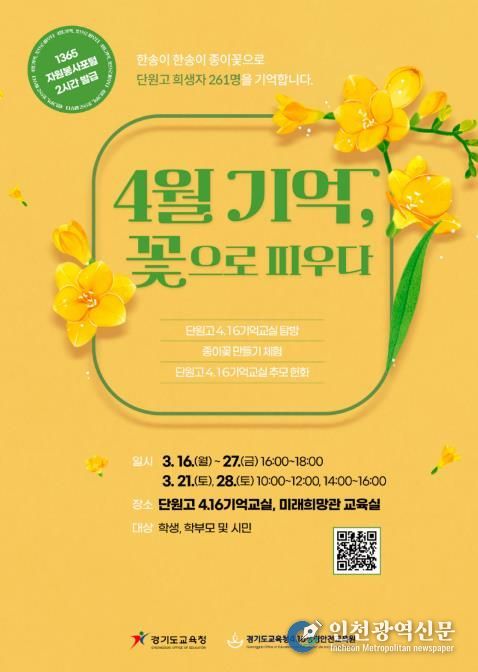 [인천광역신문] 관리자 기자 | 경기도교육청4.16생명안전교육원이 '4월 기억, 꽃으로 피우다’프로그램 참가자를 모집한다.