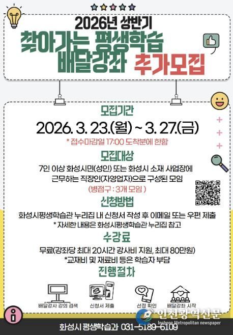 [인천광역신문] 관리자 기자 | 화성특례시는 시민의 다양한 학습 수요를 반영한 맞춤형 평생학습 프로그램 운영을 위해 ‘2026년 상반기 찾아가는 평생학습 배달강좌’를 추가 모집한다고 밝혔다.