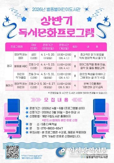 [인천광역신문] 관리자 기자 | (재)인천광역시계양구인재양성교육재단 별똥별어린이도서관은 지역주민을 대상으로 2026년 상반기 독서문화프로그램을 운영한다.