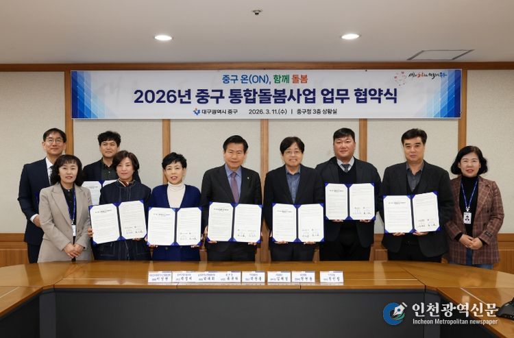 [인천광역신문] 관리자 기자 | 대구 중구는 지난 11일 구청 상황실에서 ‘중구 온(ON), 함께 돌봄’ 통합돌봄 지역특화사업의 안정적 추진을 위해 관내 7개 기관과 업무협약을 체결하고, 민·관 협력 기반의 지역 통합 돌봄 체계 구축에 나섰다.