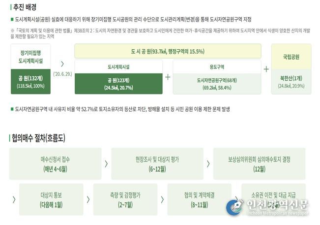도시자연공원구역의 지정목적을 달성하기 위해 필요한 경우 시민이 이용하는 등산로·산책로 등 공원 간 연결 토지에 대해 매년 공모를 통해 협의매수를 추진하고 있다. ‘정원도시 서울’ 누리집 내에서 구비서류, 접수처, 자주 묻는 질문(17건) 등 관련 정보를 한 곳에서 확인할 수 있도록 '협의매수 안내' 메뉴를 개설했다.