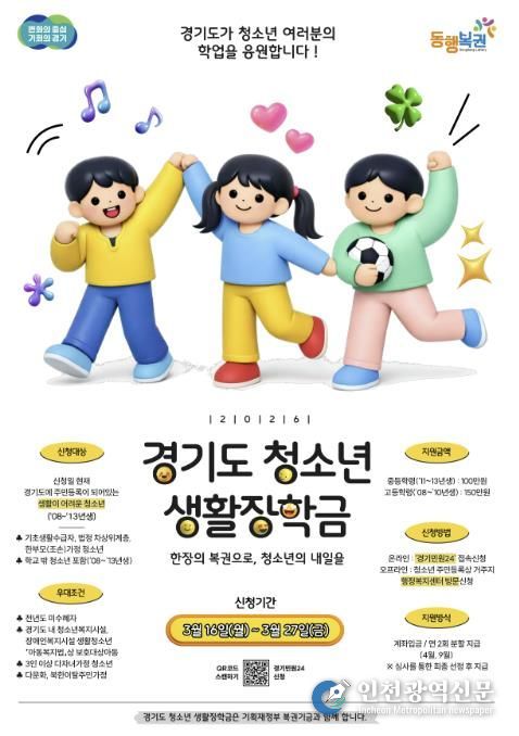 [인천광역신문] 관리자 기자 | 동두천시는 복권기금을 재원으로 하는 ‘2026년 경기 청소년 생활장학금’ 신청을 오는 3월 16일부터 3월 27일까지 받는다고 밝혔다.