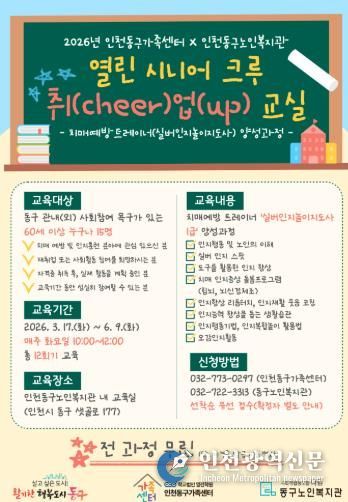 [인천광역신문] 관리자 기자 | 인천동구가족센터는 오는 17일부터 60세 이상 주민을 대상으로 치매예방 트레이너 양성과정인 ‘열린 시니어 크루 취(cheer)업(up) 교실’을 운영한다고 밝혔다.