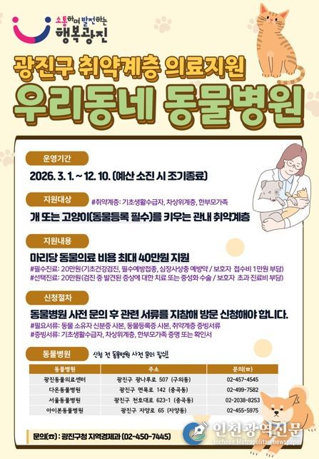 [인천광역신문] 관리자 기자 | 광진구가 경제적 어려움으로 반려동물 진료를 받기 어려운 취약계층을 위해 ‘우리동네 동물병원’을 운영한다. ‘우리동네 펫위탁소’와 함께 취약계층 반려동물을 지원하기 위한 동물 복지 정책이다.