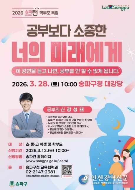 [인천광역신문] 관리자 기자 | 서울 송파구가 ‘공부의 신’으로 알려진 강성태 공신닷컴 대표를 초청해 학부모 특강을 연다. 강연은 3월 28일 오전 10시 송파구청 대강당에서 진행된다.
