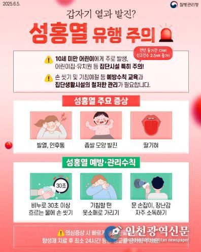 [인천광역신문] 관리자 기자 | 대구 서구보건소는 3월 새 학기를 맞아 성홍열 등 호흡기 감염병 신고 건수가 전년 대비 급증함에 따라 소아·청소년을 대상으로 예방 수칙 안내문·포스터 배부 등 감염병 예방 관리 강화에 나섰다.