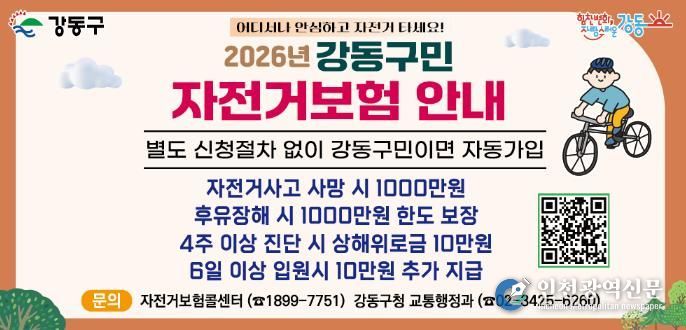 [인천광역신문] 관리자 기자 | 서울 강동구는 올해 인구 50만 시대를 맞아 구민들이 친환경 녹색 교통수단인 자전거를 보다 안전하게 이용할 수 있도록 ‘강동구민 자전거보험’을 확대 시행한다고 16일 밝혔다.