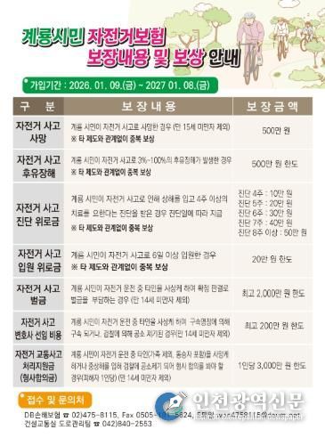 시에 따르면 자전거 보험의 보장 기간은 2027년 1월 8일까지이며, 계룡시에 주민등록을 둔 시민이면 별도의 가입 절차 없이 자동으로 보험 혜택을 받을 수 있다.