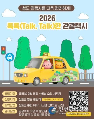 [인천광역신문] 관리자 기자 | 청도군은 개별 여행객 증가 등 관광 트렌드 변화에 대응하고 관광객의 이동 편의를 높이기 위해 오는 3월 18일부터 “2026년 청도군 톡톡(Talk, Talk)한 관광택시” 사업을 본격 운영한다.