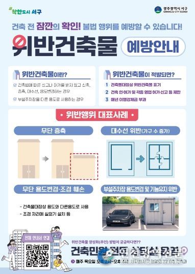 [인천광역신문] 관리자 기자 | 광주광역시 서구는 광주 자치구 중 최초로 QR코드를 활용한 ‘전자 위반건축물 예방 사례집’을 제작·배포한다고 16일 밝혔다.