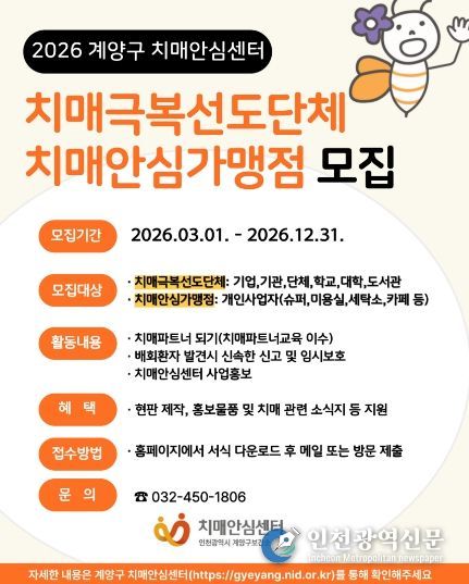[인천광역신문] 관리자 기자 | 인천광역시 계양구는 지역사회 내 촘촘한 치매 안전망 구축을 위해 3월부터 ‘치매안심가맹점’과 ‘치매극복선도단체’를 모집한다고 밝혔다.