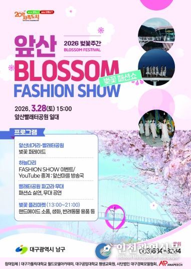 [인천광역신문] 관리자 기자 | 대구 남구는 오는 3월 28일 지역의 대표 관광명소인 앞산빨래터공원에서 벚꽃패션쇼 이벤트를 개최한다고 밝혔다.