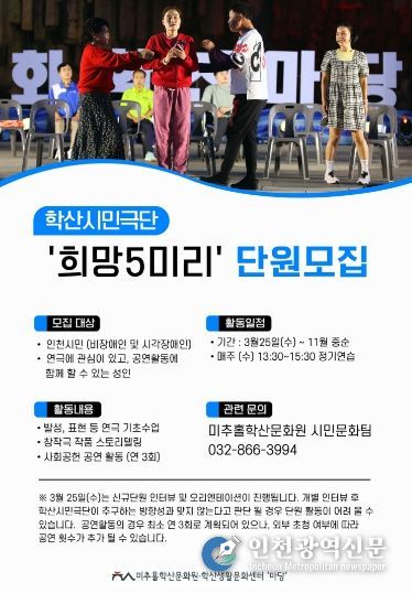 [인천광역신문] 관리자 기자 | 인천 미추홀구 미추홀학산문화원은 위탁 운영하는 학산 생활문화센터는 오는 24일까지 2026년 학산 시민극단 ‘희망5미리’의 단원을 모집한다고 밝혔다.