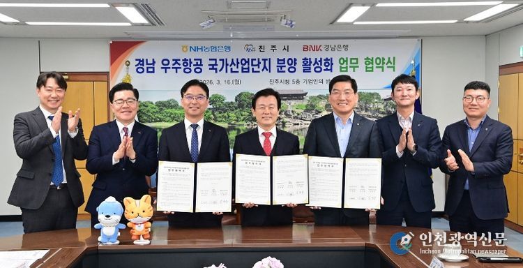 [인천광역신문] 관리자 기자 | 진주시는 16일 시청 기업인의 방에서 NH농협은행, BNK경남은행과 ‘경남 우주항공 국가산업단지 분양 활성화’를 위한 업무협약을 체결했다고 밝혔다.