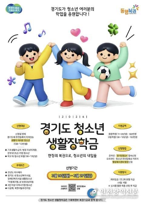 [인천광역신문] 관리자 기자 | 구리시는 오는 3월 16일부터 3월 27일까지경제적으로 어려운 청소년들의 학업 지속과 생활 안정을 지원하기 위해 오는 3월 16일부터 3월 27일까지 ‘2026년 경기도 청소년 생활장학금 지원사업’ 신청을 접수받는다.