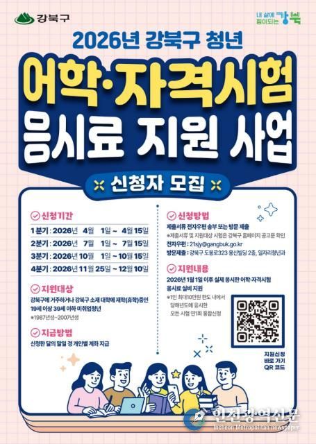 [인천광역신문] 관리자 기자 | 서울 강북구는 미취업 청년의 취업 준비 비용 부담을 덜기 위해 ‘청년 어학·자격시험 응시료 지원 사업’을 전년보다 확대 시행하고, 총 900명을 모집한다. 이는 지난해보다 200명 늘어난 규모다.