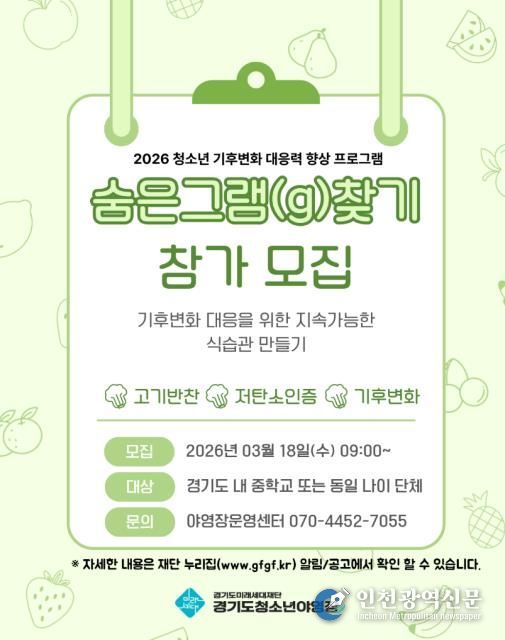 [인천광역신문] 관리자 기자 | 경기도미래세대재단은 18일부터 기후변화 대응 체험형 교육 ‘숨은 그램 찾기’ 참가 단체·학교를 모집한다.