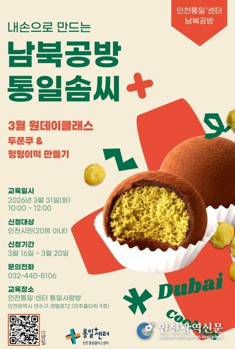 참가자 모집은 시 홍보매체와 인천통일플러스센터 사회관계망서비스(SNS) 및 블로그를 통해 공지하며 제1차 남북한 간식문화 '두쫀쿠·펑펑이떡 만들기' 클래스는 현재 신청 접수 중이다.