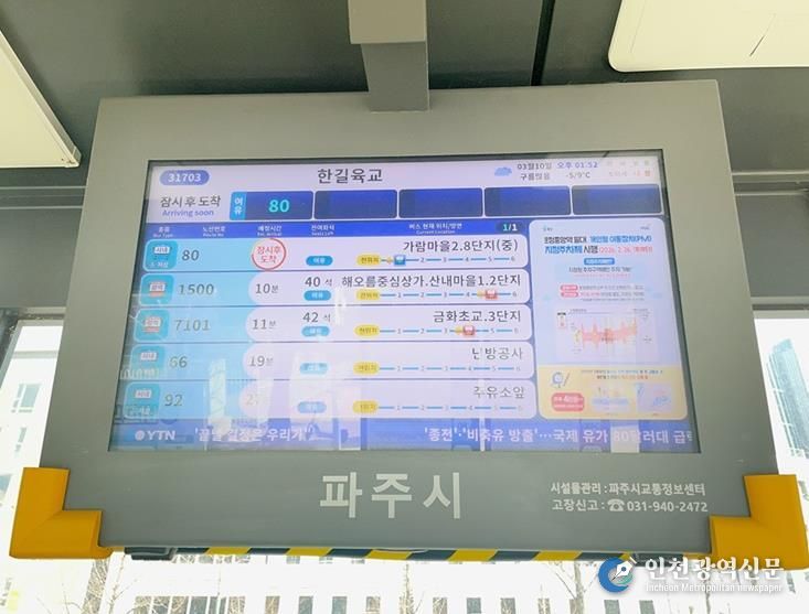 [인천광역신문] 관리자 기자 | 파주시는 대중교통 정보 소외지역의 정보 접근성을 확대하고 시민들의 대중교통 이용 편의를 높이기 위해 녪년 버스정보안내기(BIT) 신규 설치 및 노후 교체 사업’을 추진한다.