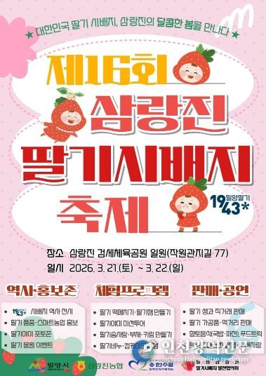 [인천광역신문] 관리자 기자 | 경남 밀양시는 오는 21일부터 22일까지 이틀간 삼랑진읍 검세체육공원 일원에서 ‘제16회 밀양삼랑진 딸기시배지 축제’를 개최한다.