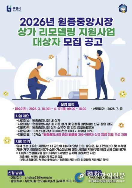 [인천광역신문] 관리자 기자 | 부천시는 3월 18일부터 4월 17일까지 ‘원종중앙시장 상가 리모델링 지원사업’ 대상자를 모집한다.