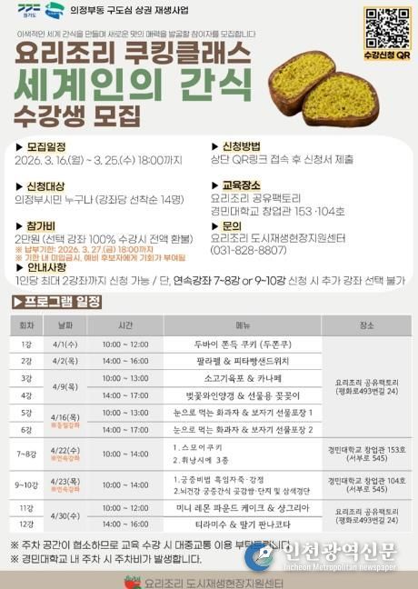 [인천광역신문] 관리자 기자 | 의정부시는 의정부 전통시장의 신선한 식재료를 활용해 이색적인 간식을 만들어 보는 요리조리 쿠킹클래스 ‘세계인의 간식’ 참여자를 모집한다.